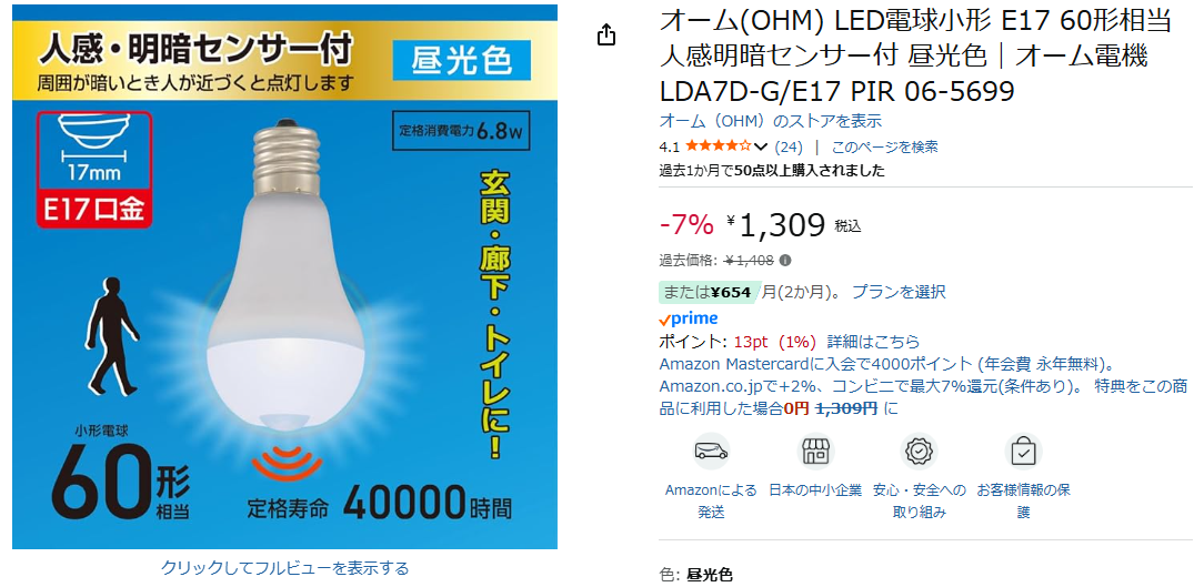 【オーム(OHM) LED電球小形 人感明暗センサー付】(アマゾン)