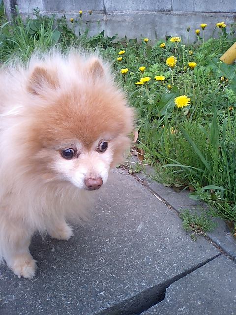 ご主人様と散歩。きれいなタンポポが咲いていました。