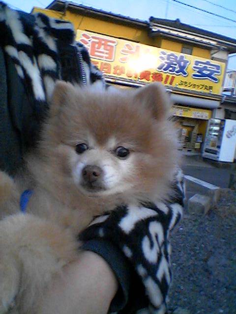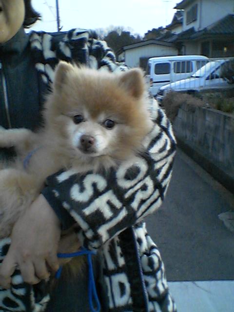 ご主人様、奥様と一緒に散歩に出かけました。ぼくは寒くて奥様のコートにくるんでもらいました。